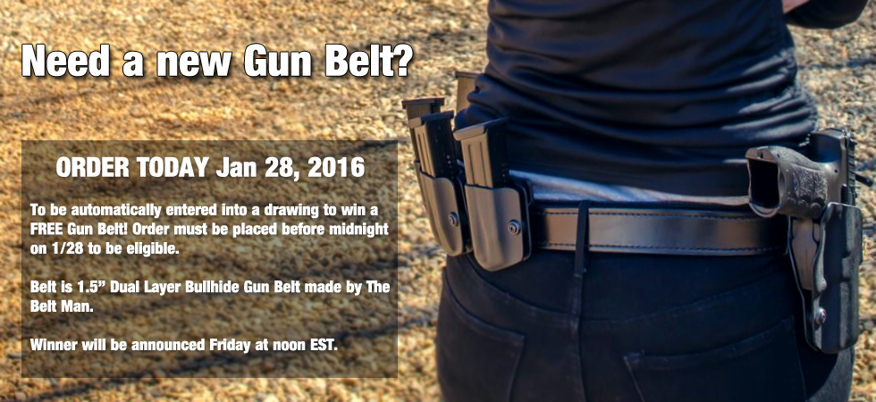 All orders placed today will be automatically entered into a drawing for a new Bullhide Gun Belt made in Apex, NC by The Belt Man. These gun belts are 1.5" in width and made from Genuine Bullhide. Winner gets choice of hide color, buckle finish and of course, size.